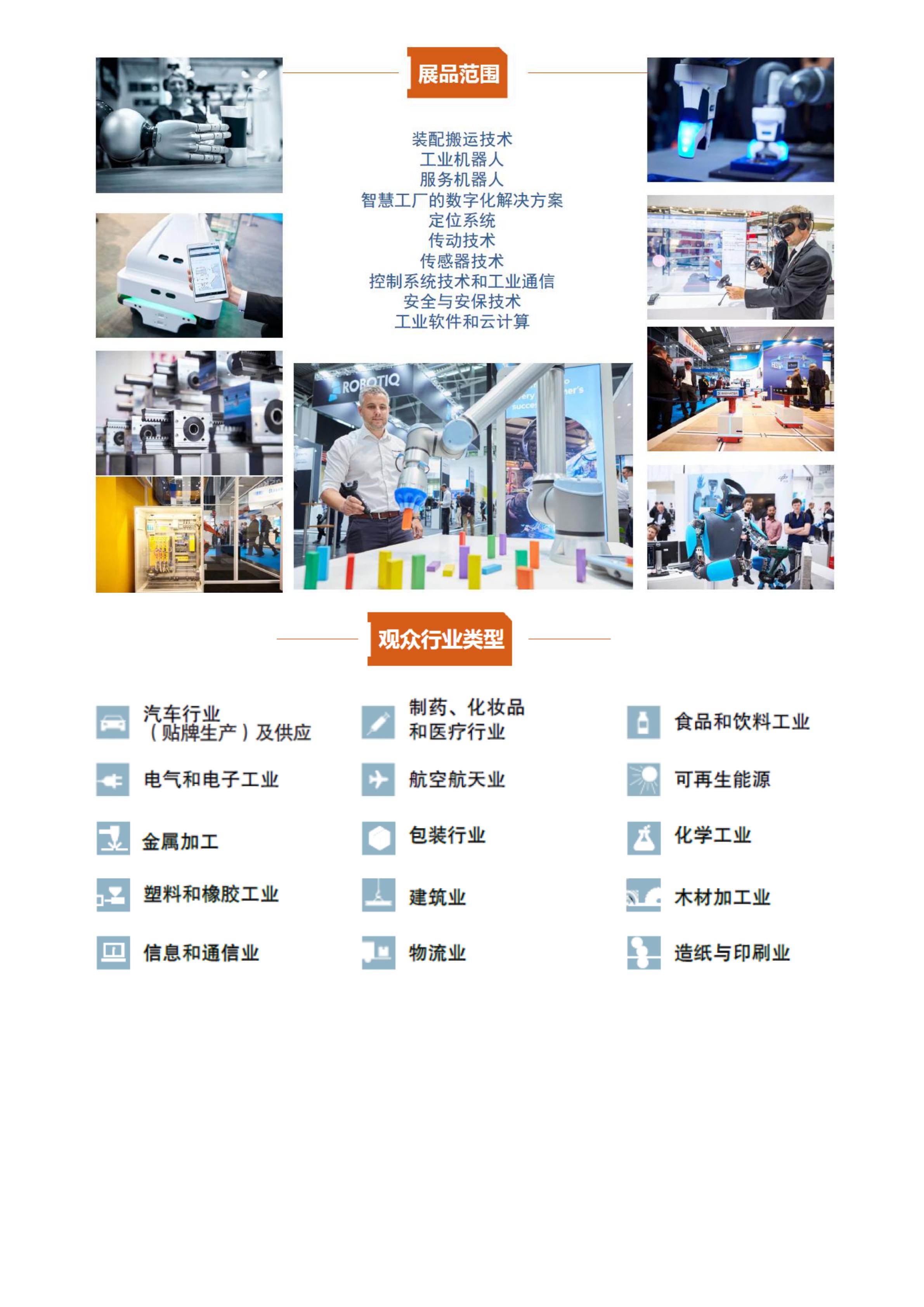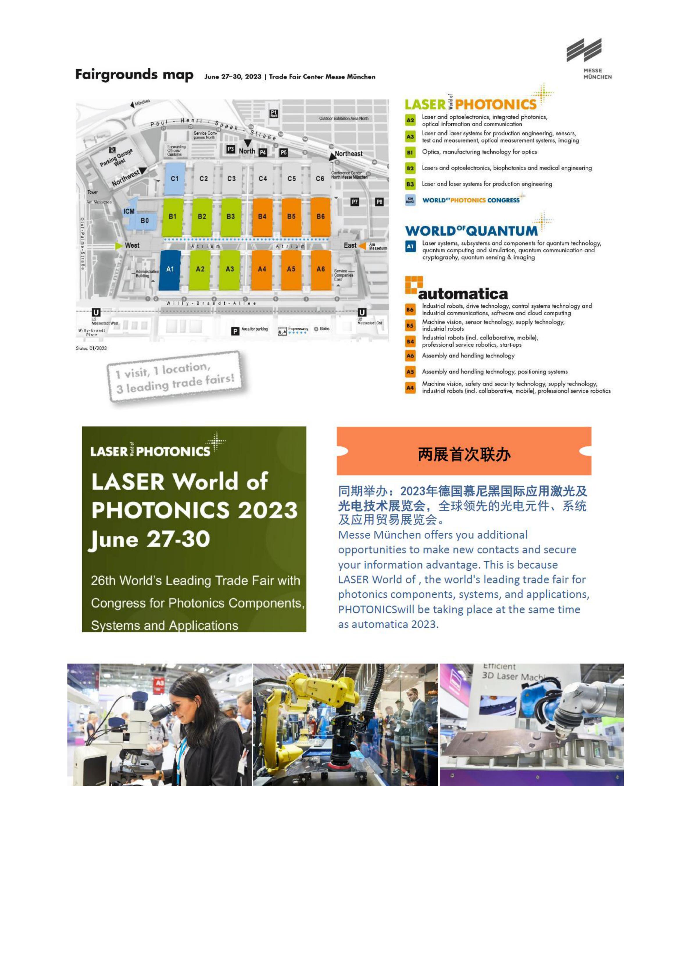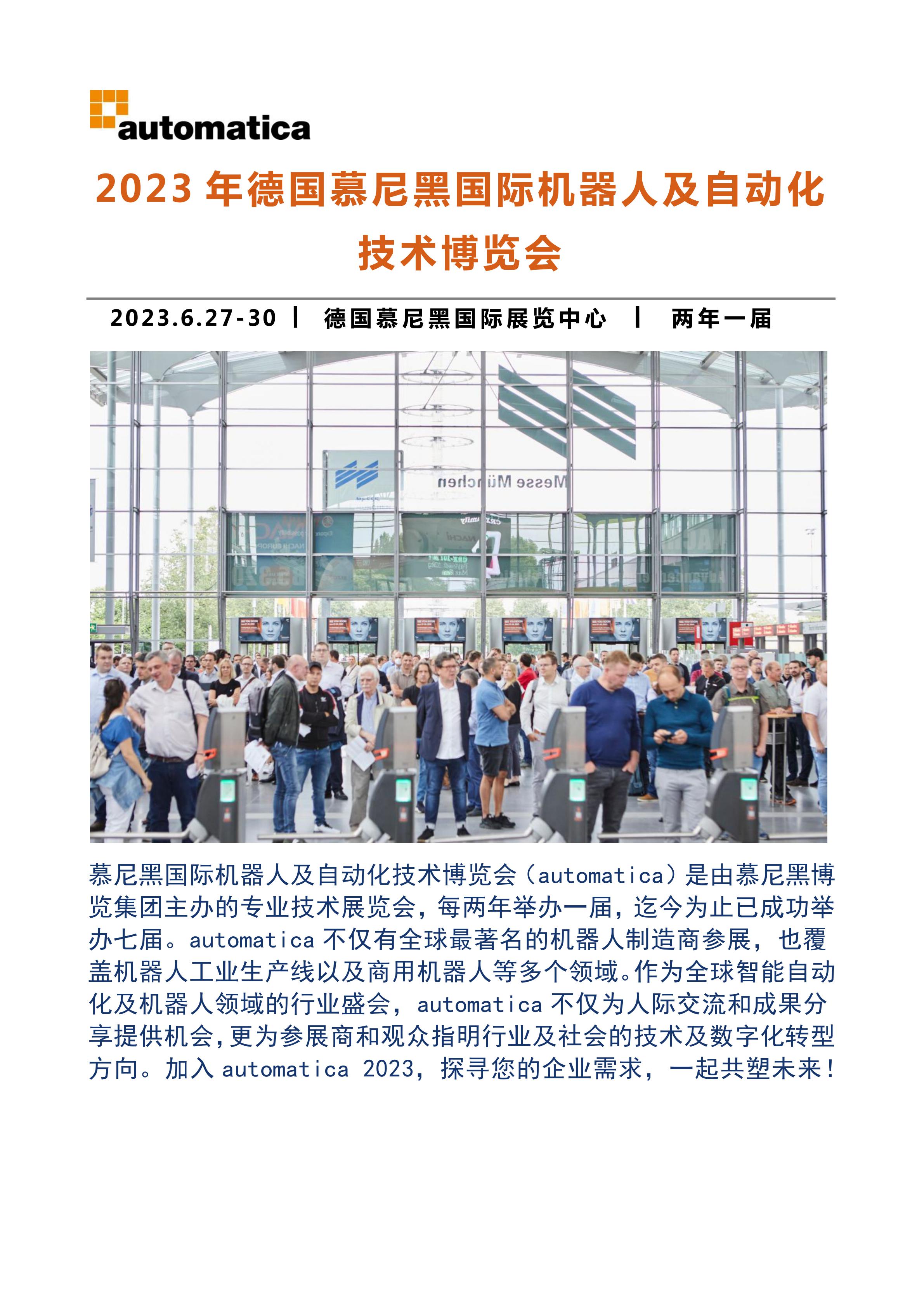 慕尼黑国际机器人及自动化技术博览会(automatica)是全球机器人及自动化解决方案的行业盛会。它涵盖了自动化的方方面面,从单个组件到完整系统,从具体应用到相关服务,呈现了整个自动化产业链,把供应商、采购商、企业管理层、产品开发商及设计师汇集到一起。随着数字化转变,automatica汇聚行业创新资讯,明确目标——更高效率地生产高质量产品。未来两年一届的德国慕尼黑国际机器人及自动化技术博览会将与德国慕尼黑国际应用激光及光电技术展览会联合举办,2023年将为第一届两展联办,本届展览会共将开放6个展馆,展商按照行业分布在不同展馆中。