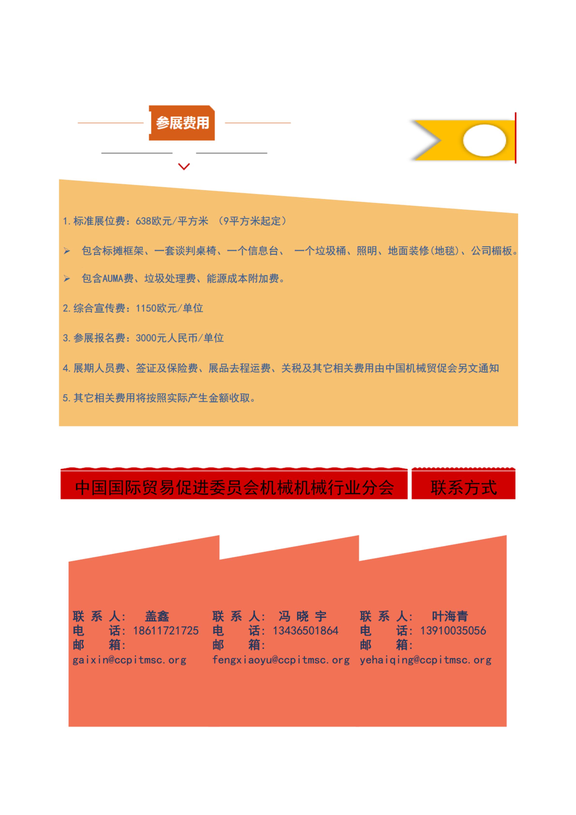 标准展位费:638欧元/平方米(9平方米起定),包含标摊框架、一套谈判桌椅、信息台、照明、垃圾桶、地面装修(地毯)、公司楣板等,以及AUMA费、垃圾处理费、能源成本附加费。