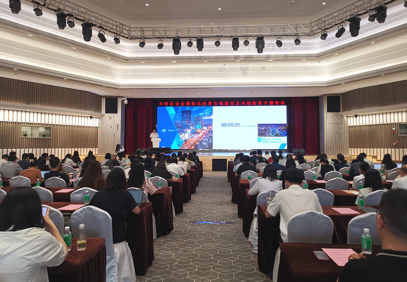5月29日,为深入贯彻落实省、市、区高质量发展大会精神,着力营造市场化、法治化、国际化营商环境,助力外向型企业应对复杂多变的全球经贸环境,护航企业“走出去”行稳致远,在市贸促会的指导下,天河区贸促会联合天河区税务局、天河区政务服务和数据管理局以及广州市律师协会共同举办“企业国际化经营合规建设及风险防范专题培训活动”,天河区近180名外向型企业及机构代表参加活动。