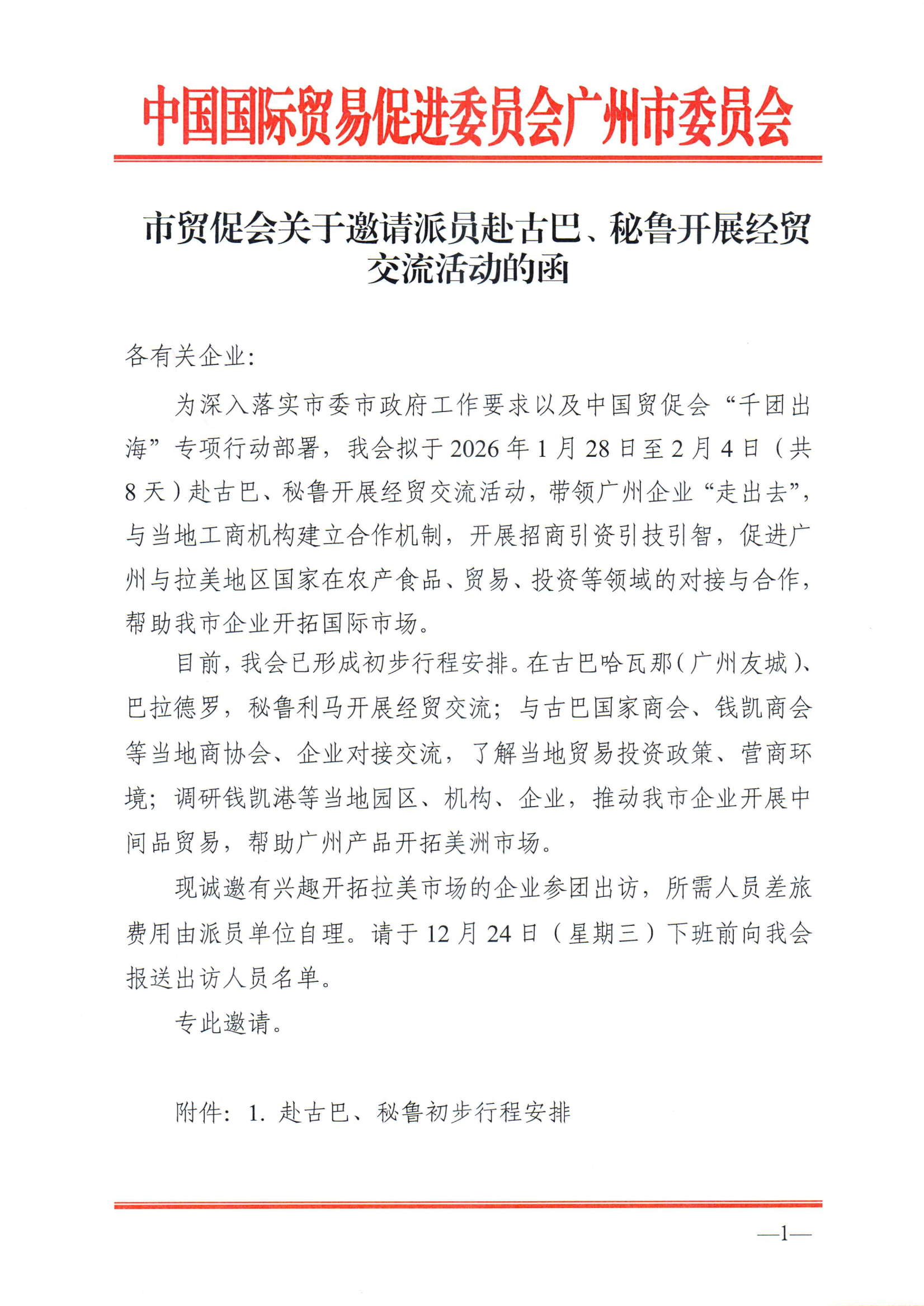 为深入落实市委市政府工作要求以及中国贸促会“千团出海”专项行动部署,我会拟于2026年1月28日至2月4日(共8天)赴古巴、秘鲁开展经贸交流活动,带领广州企业“走出去”,与当地工商机构建立合作机制,开展招商引资引技引智,促进广州与拉美地区国家在农产食品、贸易、投资等领域的对接与合作,帮助我市企业开拓国际市场。