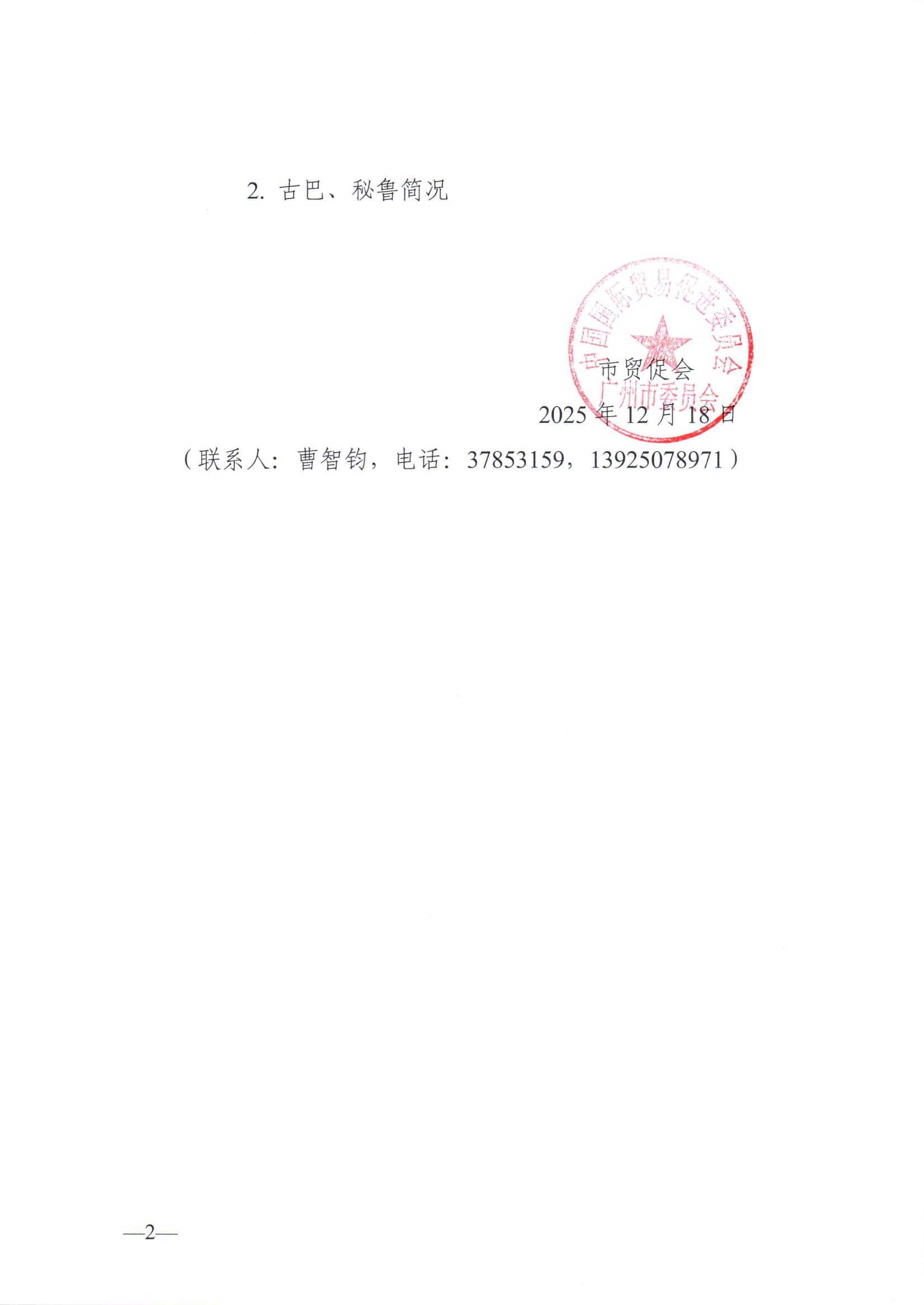 关于邀请派员赴古巴、秘鲁开展经贸交流活动的函