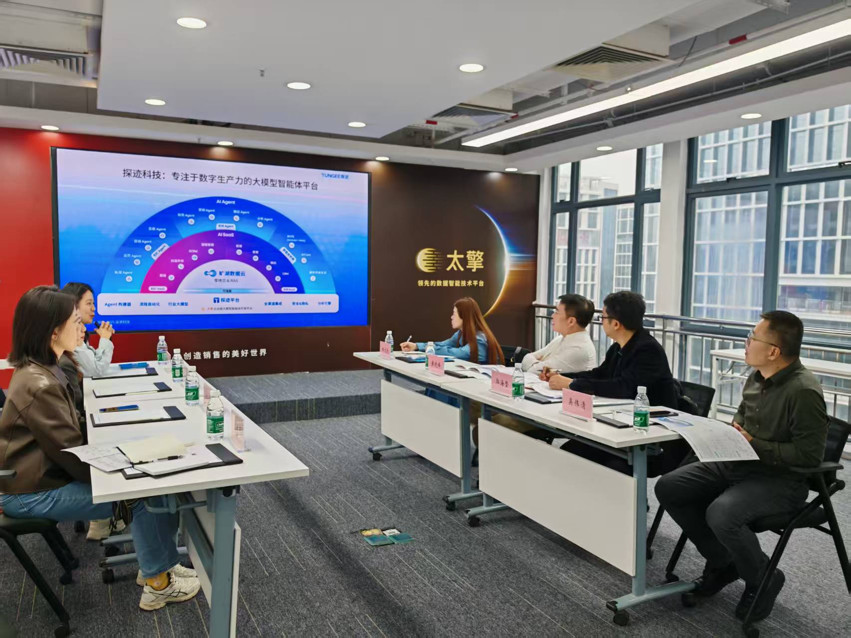 在探迹科技,市贸促会一行听取了企业介绍,与企业相关负责人围绕数字科技赋能、产业链协同合作等议题展开深入交流。作为专注于数字生产力的大模型智能体平台,探迹科技以人工智能和大数据技术为核心,构建了涵盖 B2B与 B2C核心场景的AIApent和AISaaS,打造了全流程智能销售矩阵,服务客户超50000家,涵盖阿里巴巴、字节跳动等行业巨头,荣获“专精特新”“全球独角兽”等多项荣誉。调研小组详细了解了企业在技术研发、市场拓展等方面的情况,针对企业关注的国际供应链合作需求,精准推介了第四届链博会数字科技链展区的特色与优势。
